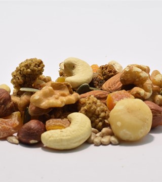 Ingrediënten: cashews, amandelen, hazelnoten, walnoten, paranoten, pecannoten, macadamia's, goji en moerbei bessen, gedroogde vijgen en abrikozen stukjes, zonnebloempitten en pompoenpitten